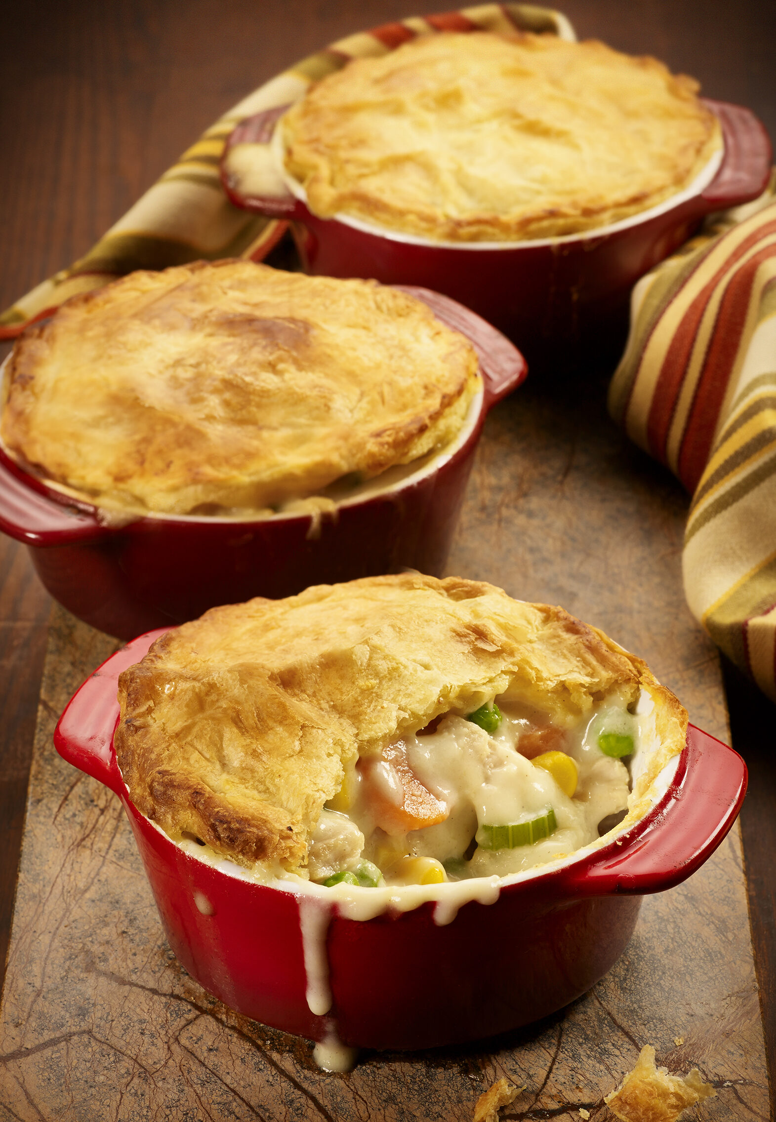 - or add 1/4 cup extra broth or cream and make individual servings with puff pastry squares over top (cut slits into the pastry to allow steam to escape), and bake for 25 minutes;
